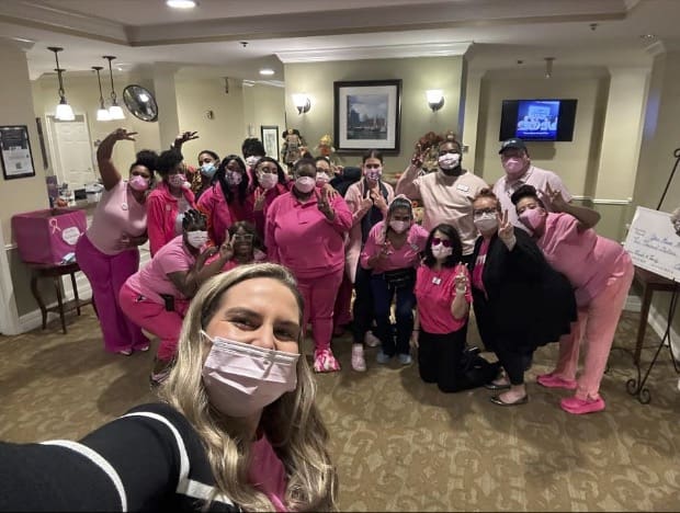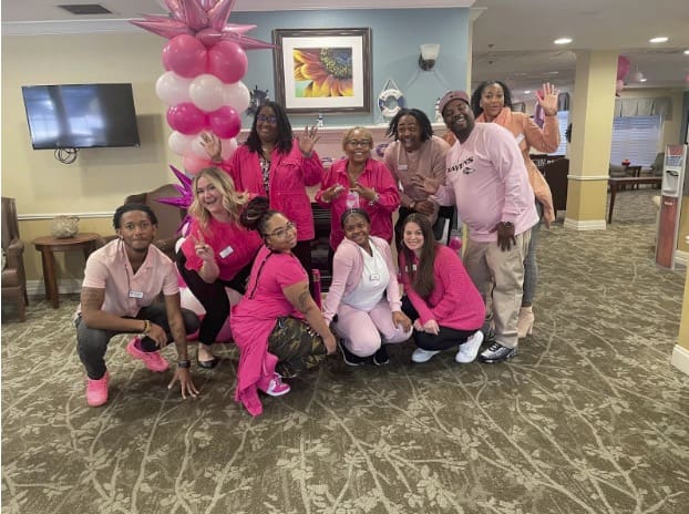 Residents and staff at Charter Senior Living of White House dressed in pink with bra decorations for breast cancer awareness.